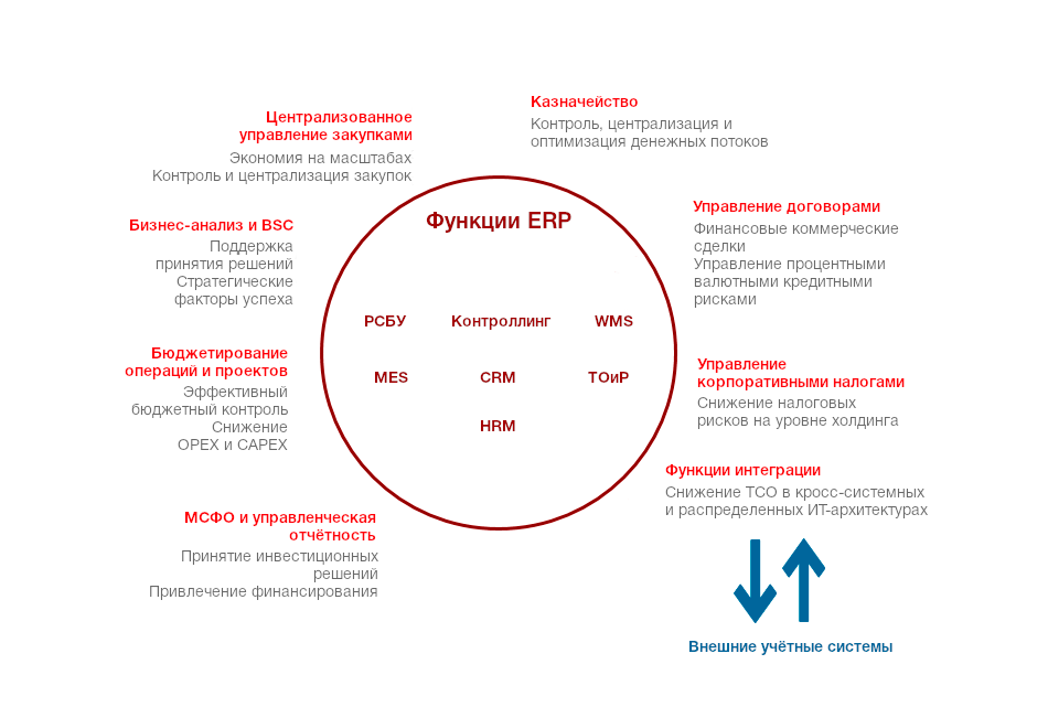 - Система для общих центров обслуживания крупных холдингов с централизацией функций регламентированного учёта, учёта по МСФО, казначейства, закупок и снабжения.